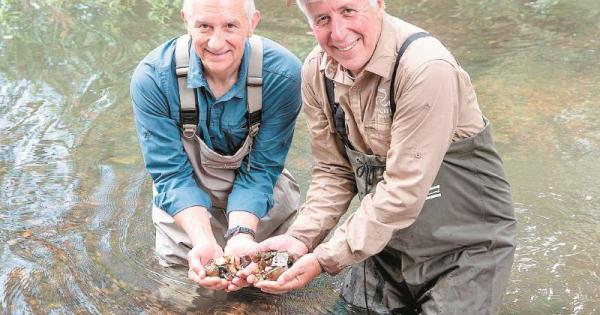 Image: Stuart Spindler (L) and Martin Salter (R) displaying some of the 80 tonnes of gravel introduced to the Loddon to create new spawning habitat.