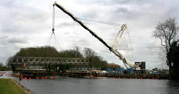 A bridge that will be used by thousands of Olympics spectators this summer has been lifted into place at Dorney Lake.
