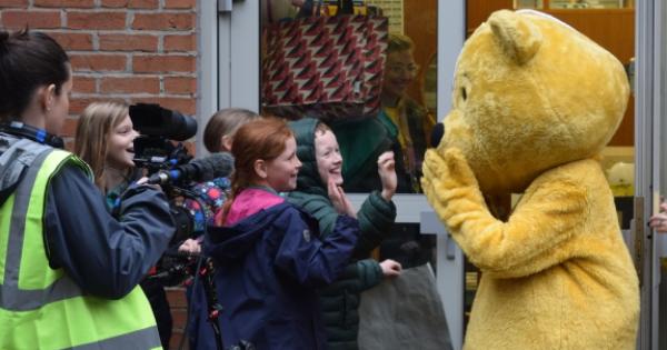 The children cheered as the film crew arrived with the appeal mascot, Pudsey the bear. He danced and gave hugs as he made his way around the playground, where the children had gathered in a circle.