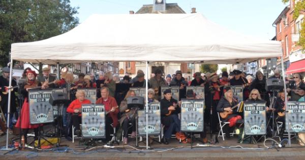 About 50 people gathered under a white gazebo, near to the town hall to form Sam Brown’s Fabulous Ukulele Band.