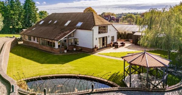 Converted in 2014 from an open Dutch barn, it now provides 5,231 sq ft of accommodation, including the main house, a double garage with two self-contained flats and further outbuildings, all arranged within wraparound landscaped gardens.